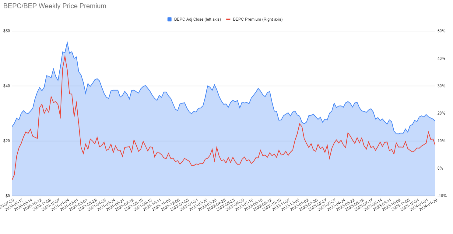 This chart shows the premium of BEPC weekly closing prices over BEP closing prices on the dates indicated.  Data was collected from Yahoo! Finance on February 5, 2024.